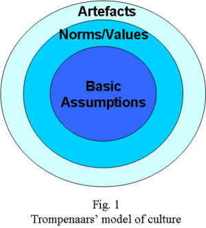 Trompenaars (1993) - Riding the Waves of CultureThe author has lots of questions which he has asked a number of people from lots of cultures, the answers of which he uses to classify them into a certain type (Although Trompenaars and Hofstede don't actually like each other, their work is pretty similar). Below is a model of culture, which outlines the different levels of culture in any individual or organisation (Fig.1).
