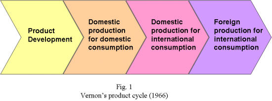 Vernon - The product cycleVernon (1966, 1979) developed a product cycle, which he argues follows a specific pattern of product development, beginning at home and then spreading abroad in a particular and predictable fashion. The product cycle has implications for the pattern of international trade.
