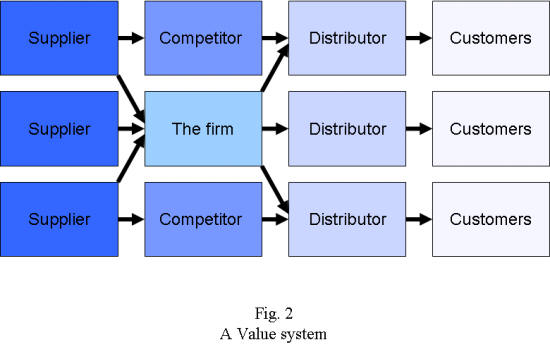 Value systemThe value chain observes the difference between firms, such as design and manufacturing, marketing and sales, or manufacturing and marketing. In order to select an appropriate value chain, a firm must understand the nature of the value system within which it operates. The Value system includes a firm's value chain and those of all the companies connected to this firm's operations, either upstream (closer to the supplier) or downstream (closer to the customer) From this the firm can choose which activities in the value chain to focus upon and which to form external relationships. For example, this is an example of a value system (Fig.2):