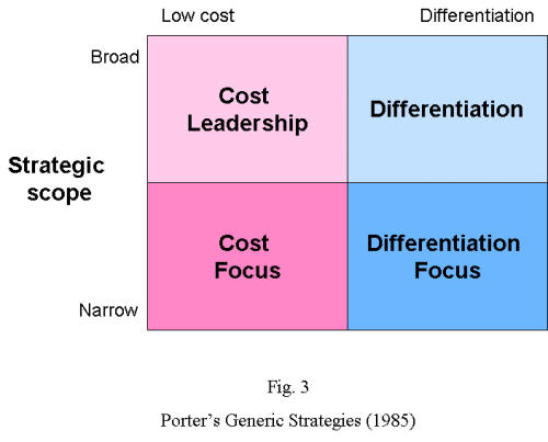 Strategies - Generic/Competitive positioningPorter (1985) devised a set of generic strategies, arguing that competitive advantage depends on a best selection of templates, including cost leadership, differentiation and focus.
