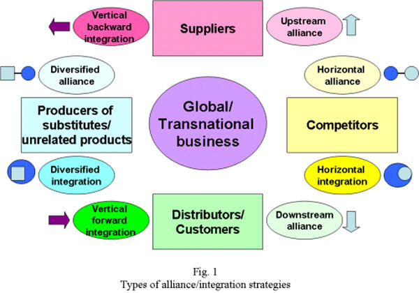 Stonehouse et al. (2004) - Managing Global Mergers, Acquisitions and AlliancesExternal growthPortfolio perspective - benefits include the integration and leveraging of financial resources, entry into new businesses and markets, and the spreading of risks. Increases the ability to respond flexibly to changes in the environment Core competence perspective - M&As and alliances perform better by creating synergy. Leveraging core competences between businesses also increases bargaining power against customers and suppliers. Alliances improve links to distributors, result in shared marketing and finances. Types of integrations and alliancesCross border deal failure rates are 20-50%. However, there are some alliance and integration strategies firms can follow, in terms of their relationships (Fig.1).