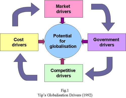 Stonehouse et al. (2004) - Global Strategic ManagementManagers need to be aware of both the micro (competitors) and macro-environments (global changes), as the latter affects the former, making them interdependent. Managers always need to be aware of the context of the situation when making decisions. The macro-environment is continually changing, but it is difficult to predict in which direction it is going to shift and how that will affect the micro-environment and the firm itself. Yip (1992) devised global drivers, which outlines the forces which can lead a firm to become global (Fig.1).