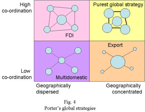 Value System(For more information, see Porter Changing Patterns of International Competition) Porter's model of global strategy (1986) is based on a generic strategy framework. He argues that a market must be global for a firm to be successful, otherwise it is better to stay at home. Porter discusses the configuration (where) and co-ordination (how) of activities, where the former can be concentrated or dispersed and the latter can be high or low (For the 2x2 matrix, see lecture 6). Below shows the types of global strategy that can be employed, in terms of configuration and co-ordination of activities.