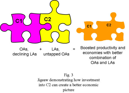 Thus Case A is one where the firms in C1 retain their OAs, whilst C1's LAs decline over time, such as rising labour costs, making it less efficient. Firms can use LAs in C2 to replace those in C1 (Fig.3).